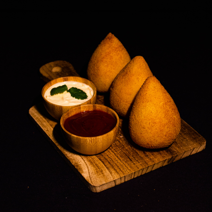 Massa douradinha e crocante, recheada com frango desfiado e temperado, garantindo sabor e suculência em cada mordida.