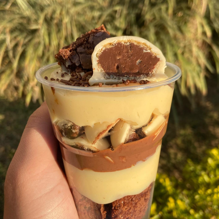 Camadas de bolo, creme e coberturas irresistíveis em um pote, criando uma sobremesa deliciosa e perfeita para adoçar o seu dia.