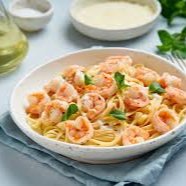 Spaghetti ao molho branco servido com suculentos camarões.
