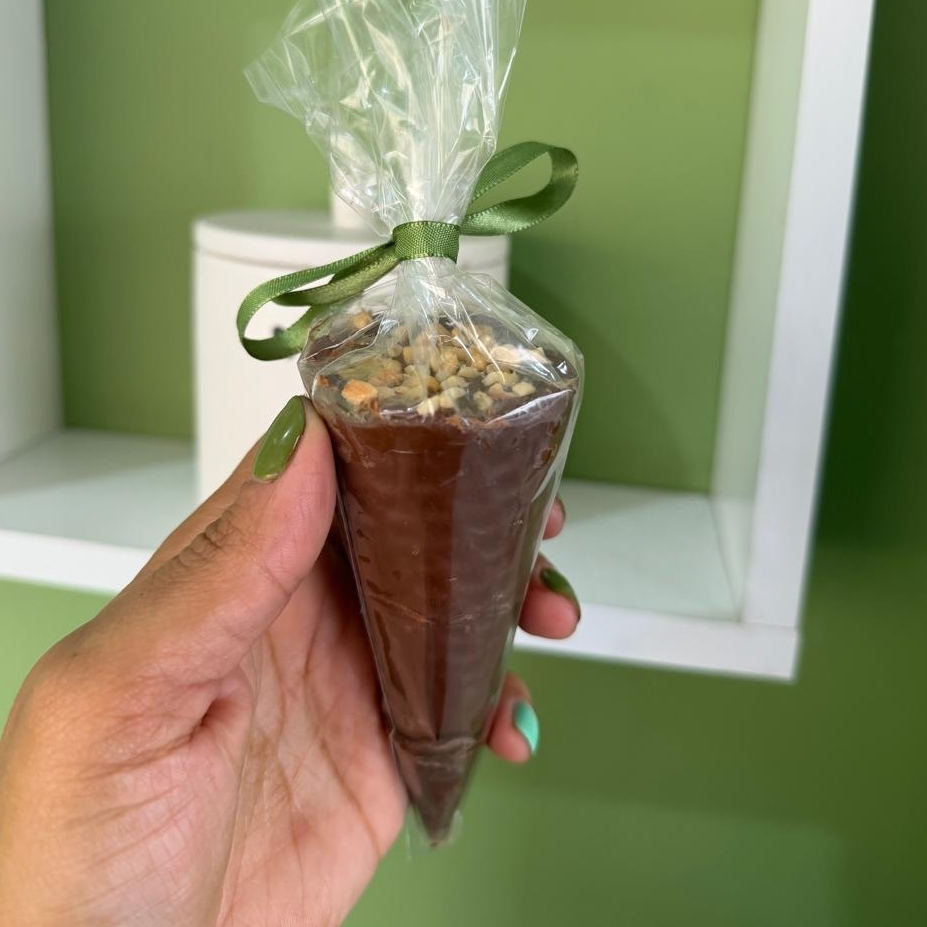 Casquinha coberto por chocolate recheado com Nutella e amendoim.