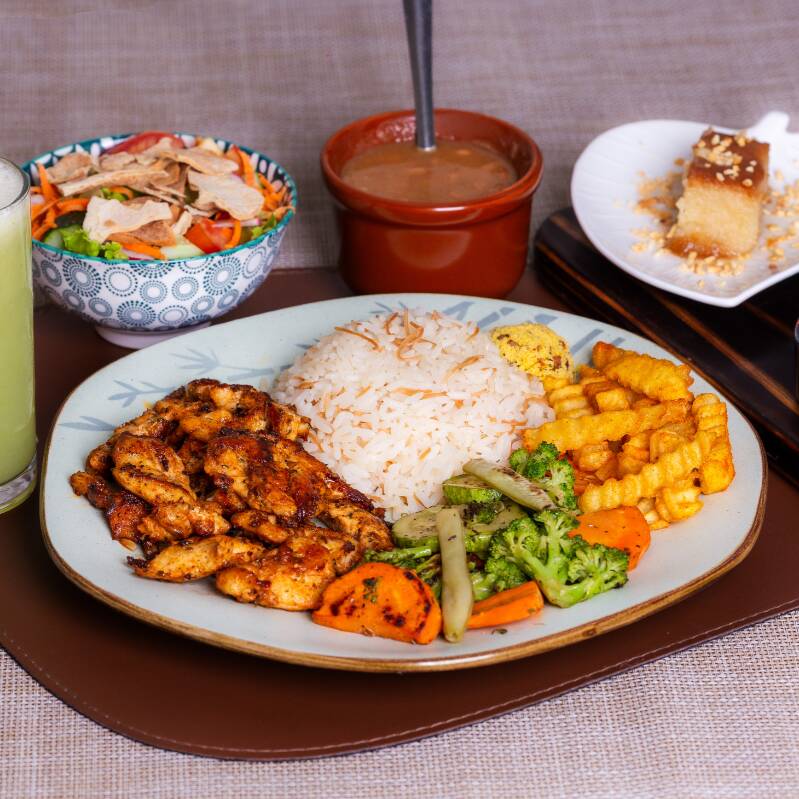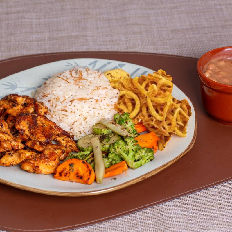 - Arroz árabe (arroz com cabelinho de anjo) - Feijão com temperos árabes (recipiente separado)- Farofa fina de milho, soja, temperos e erva finas - Filé de frango preparado na chapa (100g) - Mix de legumes salteados (abobrinha, cenoura, brócolis e vagem) e batata frita.