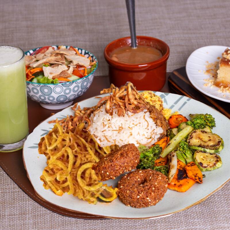 - Kabsa (arroz, cenoura, grão de bico, pimentão, mix (nozes, amêndoas, castanha e amendoim) e uva passa) - Kibe frito vegano recheado com abobrinha, berinjela e temperos - Mix de legumes (abobrinha, cenoura, brócolis e batata)