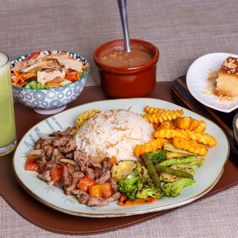 - Arroz árabe (arroz com cabelinho de anjo) - Feijão com temperos árabes (recipiente separado)- Farofa fina de milho, soja, temperos e erva finas - Iscas de maminha com tomate e cebola preparada na chapa - Mix de legumes salteados (abobrinha, cenoura, brócolis e vagem), e batata frita.