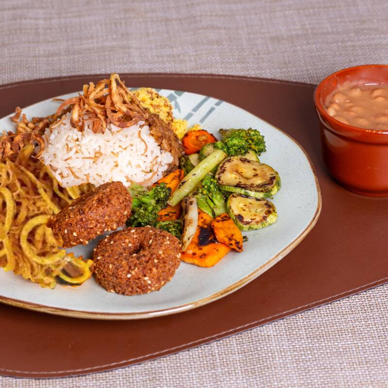 Arroz árabe - Feijão - Legumes Salteados - 2un Bolinho de Falafel - cebola crispy - farofa de milho.