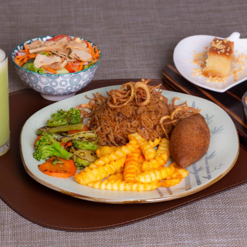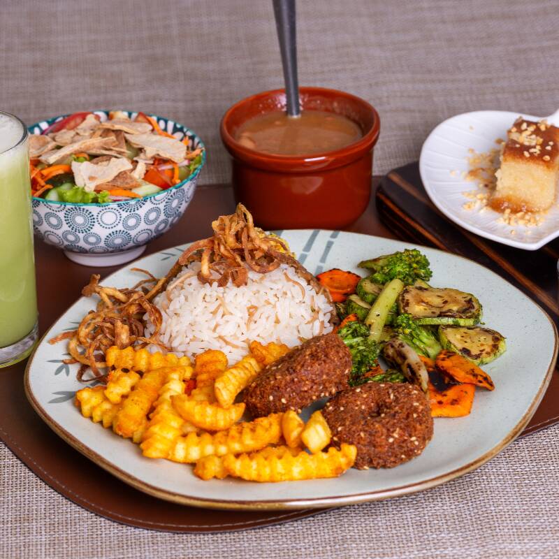 - Mjadara (arroz, lentilha e cebola crispy) - Kibe frito recheado com carne - Legumes Salteados(cenoura, abobrinha, vagem e brócolis) e Batata frita com páprica