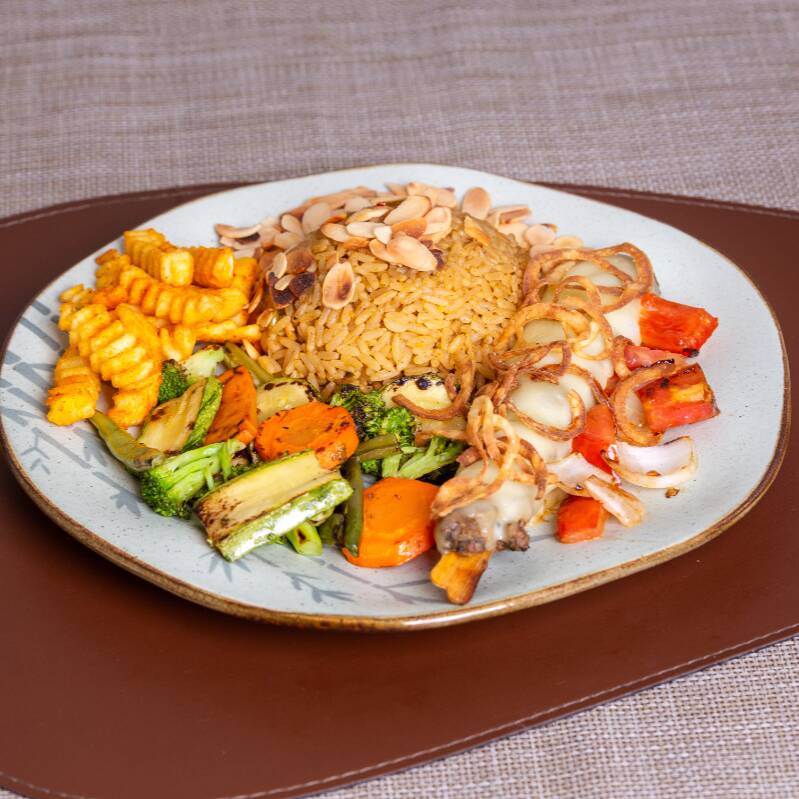 - Kabsa (arroz, cenoura, grão de bico, pimentão, almendras fatiadas torradas ) - Kafta assada no espeto - Tomate e cebola assada - Mix de legumes (abobrinha, cenoura, brócolis e batata) - Batata frita com páprica