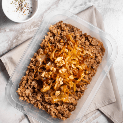 Leve toque de pimenta síria, decorado com cebolas caramelizadas e nozes. Acompanha coalhada com pepino.