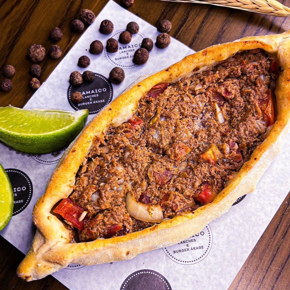 A nossa 'Esfiha de Carne Aberta' é uma verdadeira explosão de sabores. O recheio é composto por uma suculenta carne moída, cuidadosamente temperada e preparada ao ponto. Acompanha o frescor dos tomates selecionados e o crocante da cebola, que proporcionam um equilíbrio perfeito. O toque especial fica por conta do limão, que adiciona uma leve acidez e aguça ainda mais o sabor. Os temperos são escol