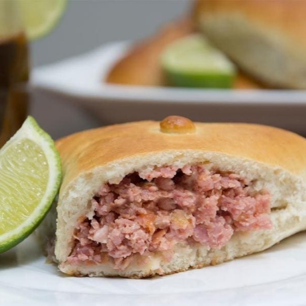 Bolinho recheado com carne moída, bem temperado, com aquela massa sequinha!!!