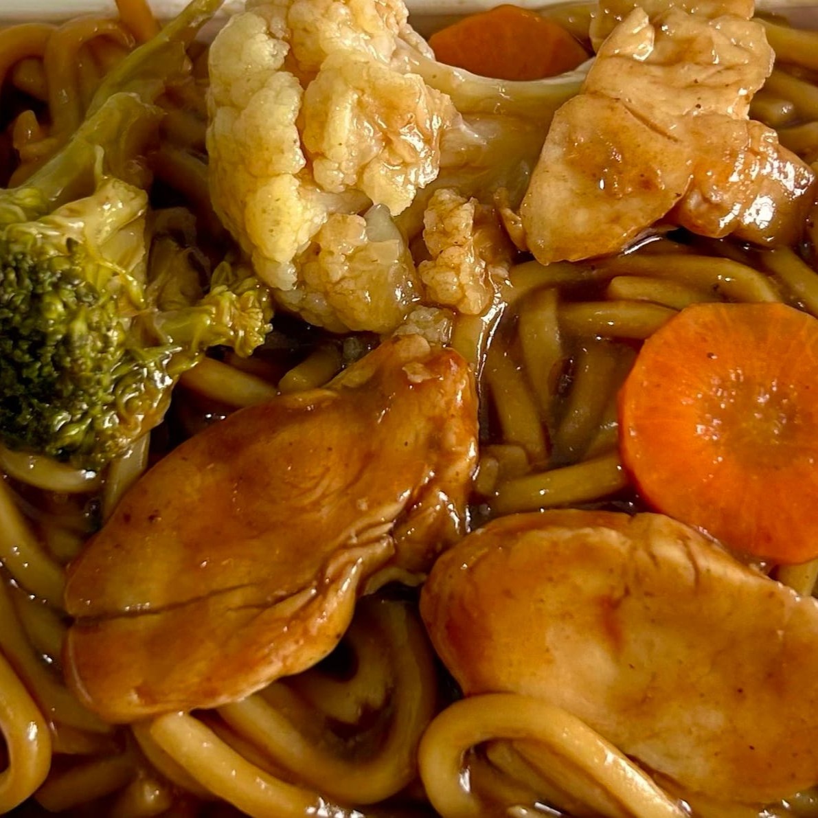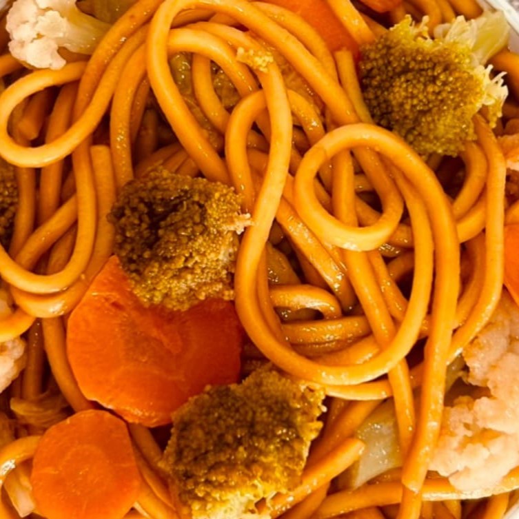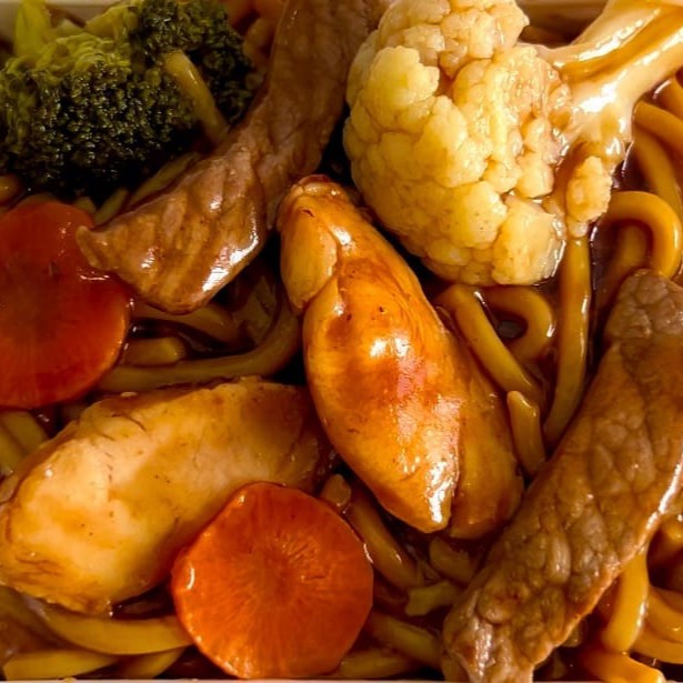 Clássico macarrão oriental, com carne e frango, legumes e champignons. Molho à base de shoyu e um tempero delicioso. Finalizando com brócolis, cenoura, couve-flor, cebola e acelga.