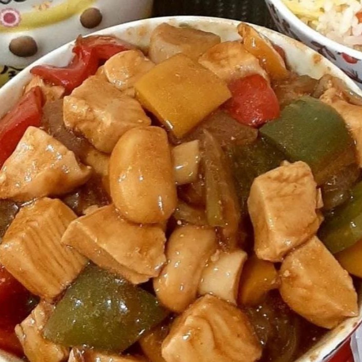 Deliciosos cubos de peito de frango, cebola, pimentão verde, pimentão vermelho, pimentão amarelo e champignon, unidos com um molho especial à base de shoyu.(aprox. 500g)