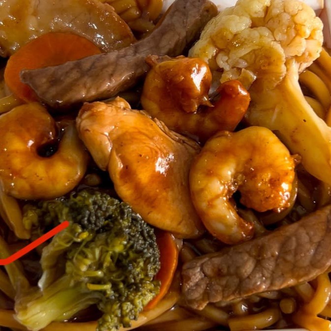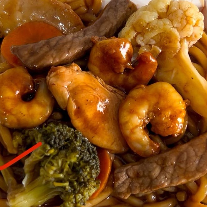 Clássico macarrão oriental, com carne, frango, deliciosos camarões, legumes e champignons. Molho à base de shoyu e um tempero delicioso. Finalizando com brócolis, cenoura, couve-flor, cebola e acelga.
