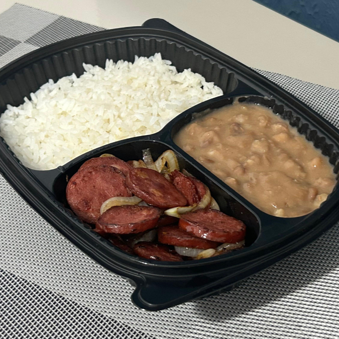Calabresa em rodelas, grelhadas, combinadas com arroz soltinho e o delicioso feijão carioca com tempero especial.