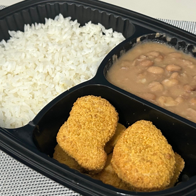 Nuggets (4 unidades), crocantes, combinados com arroz soltinho e o delicioso feijão carioca com tempero especial.