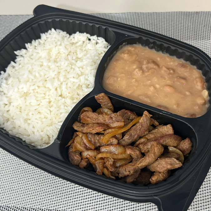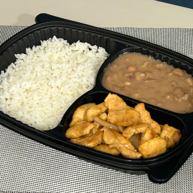 Iscas de filé de frango, grelhadas, combinadas com arroz soltinho e um delicioso feijão com tempero especial.