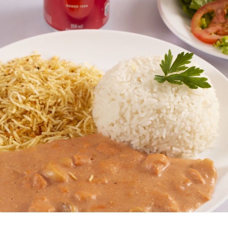 Acompanhamento: arroz, batata palha, e salada (alface, tomate, cebola, beterraba ou cenoura). * feijão opcional.