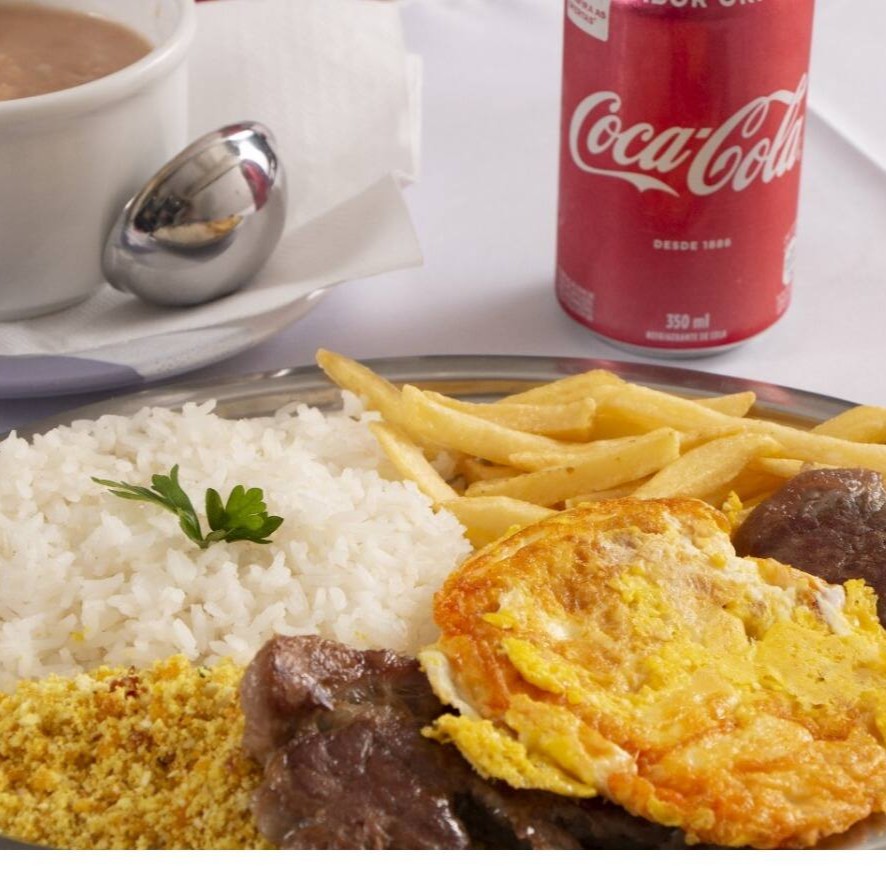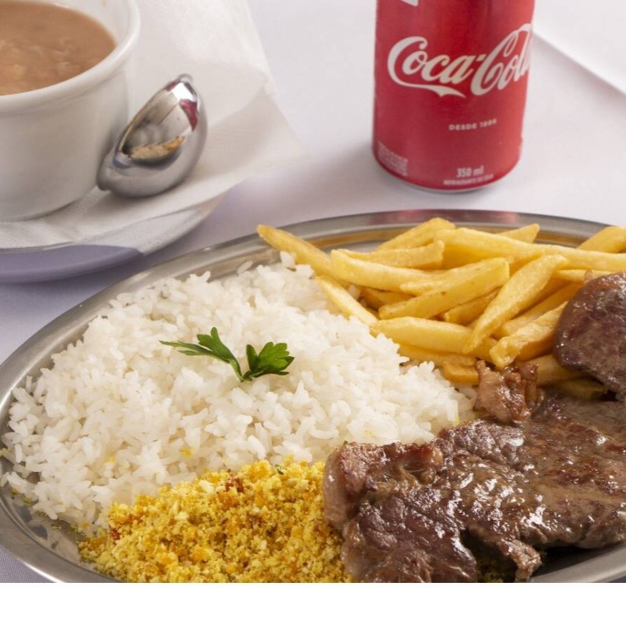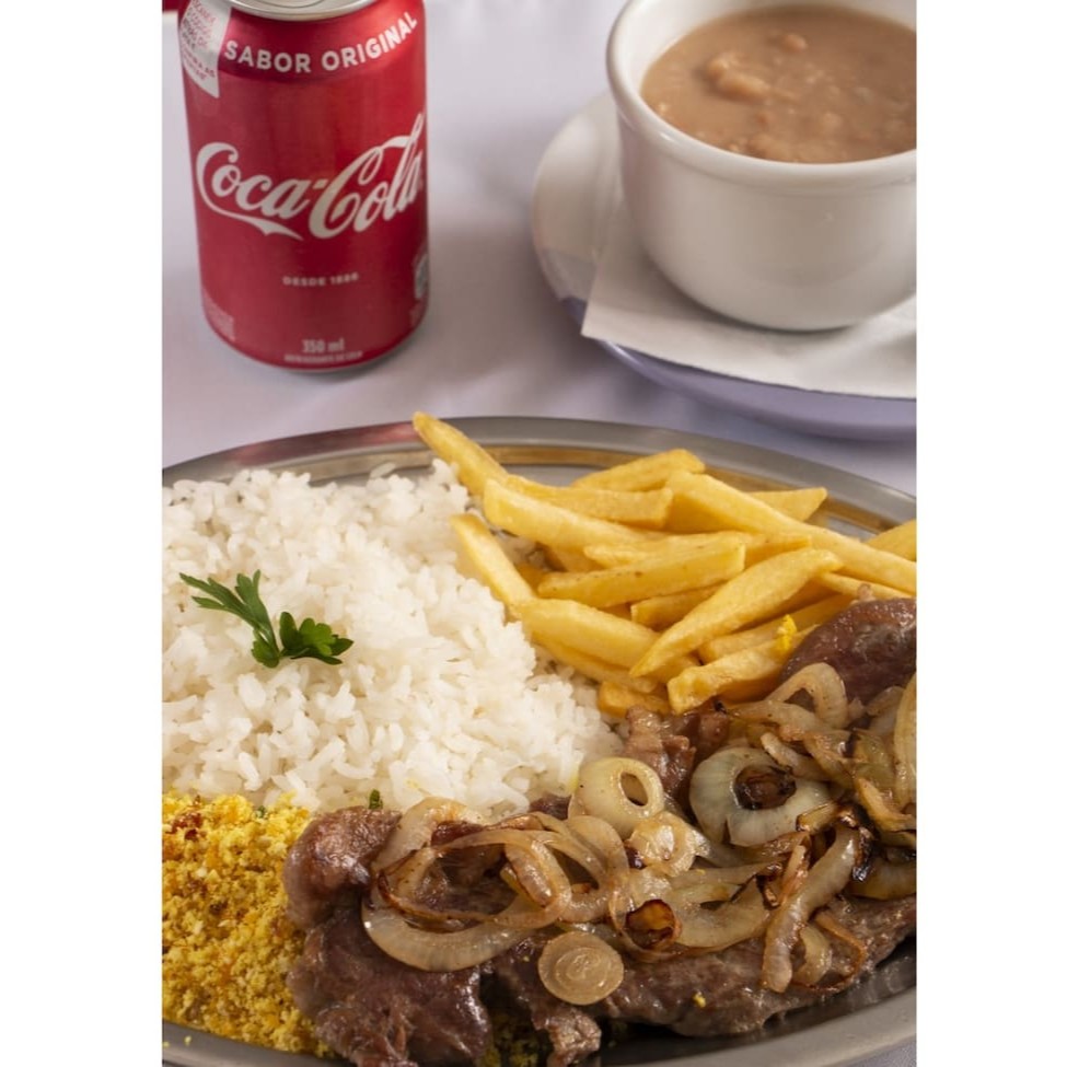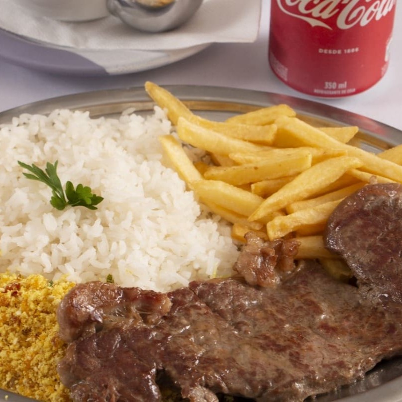 Acompanha: arroz, feijão, fritas, farofa, 2 ovos e salada (alface, tomate, cebola, beterraba ou cenoura).