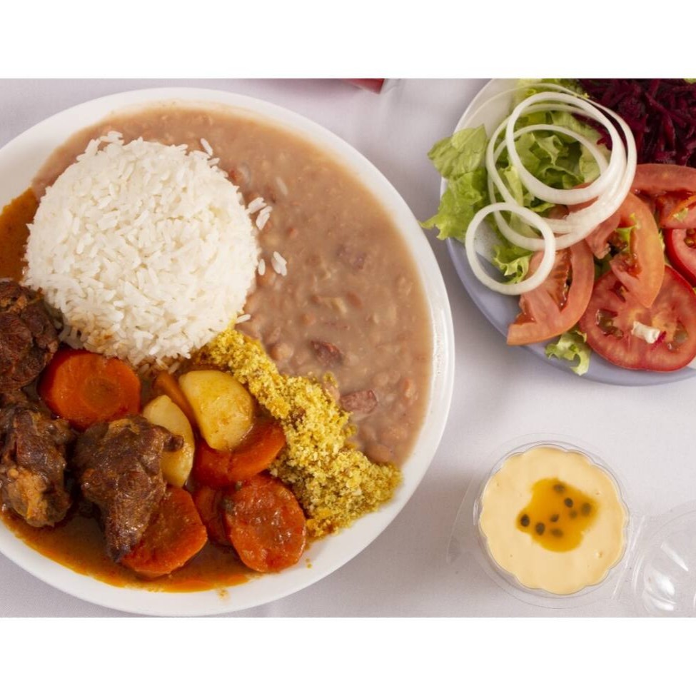 Acompanhamento: arroz, feijão, farofa e salada (alface, tomate, cebola, beterraba ou cenoura).