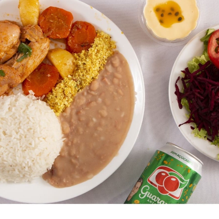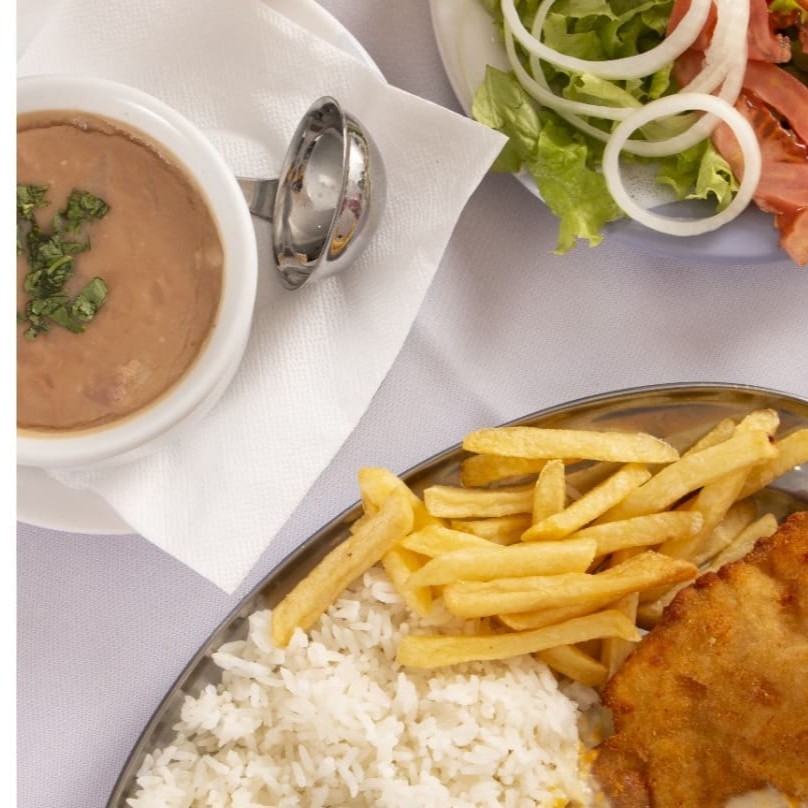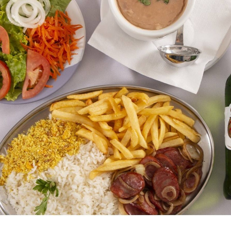 Acompanhamento: arroz, feijão, farofa, fritas e salada (alface, tomate, cebola, beterraba ou cenoura).