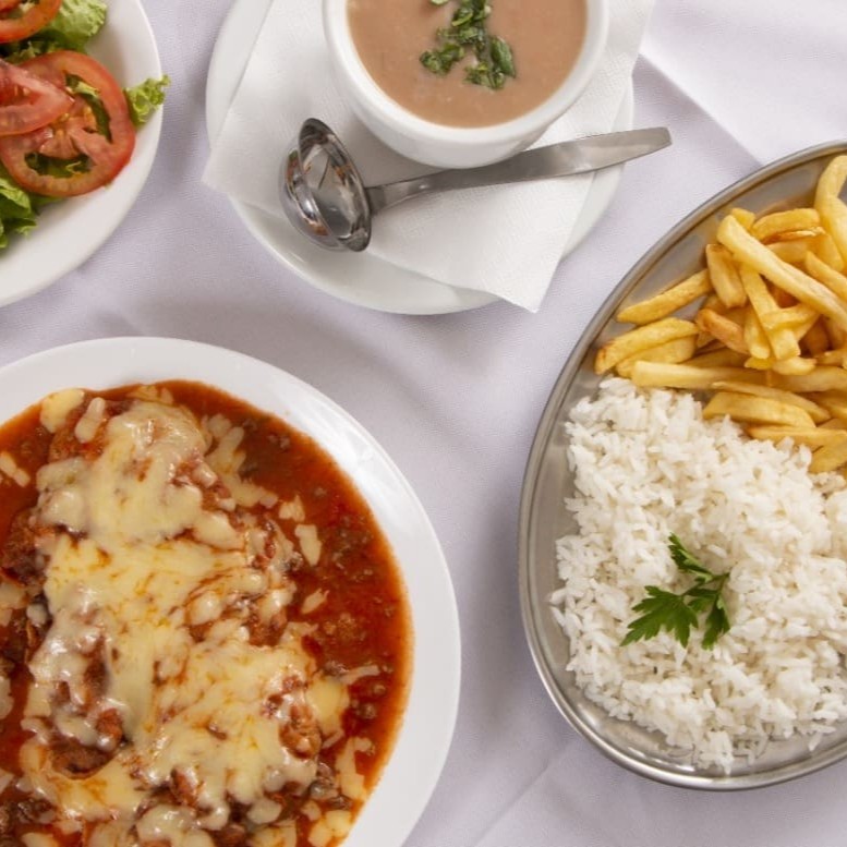 Acompanhamento: arroz, feijão, fritas, farofa e salada (alface, tomate, cebola, beterraba ou cenoura).