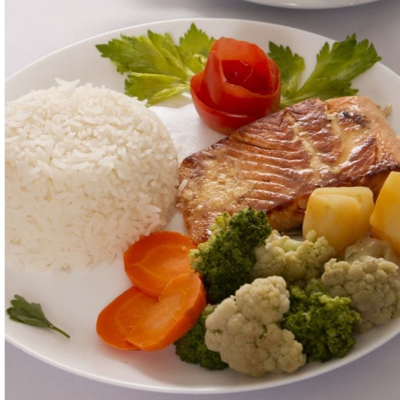 Salmão grelhado com legumes arroz e salada . feijão opcional.