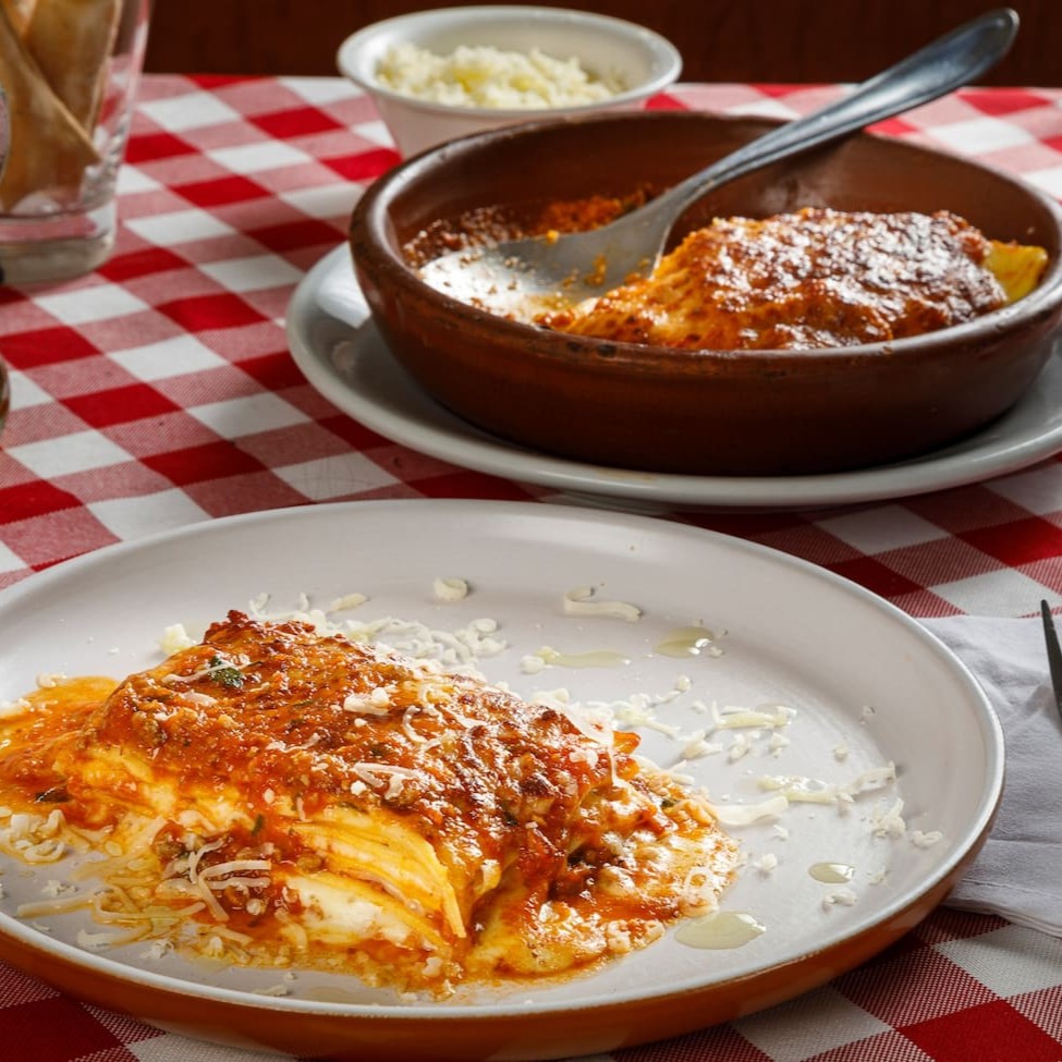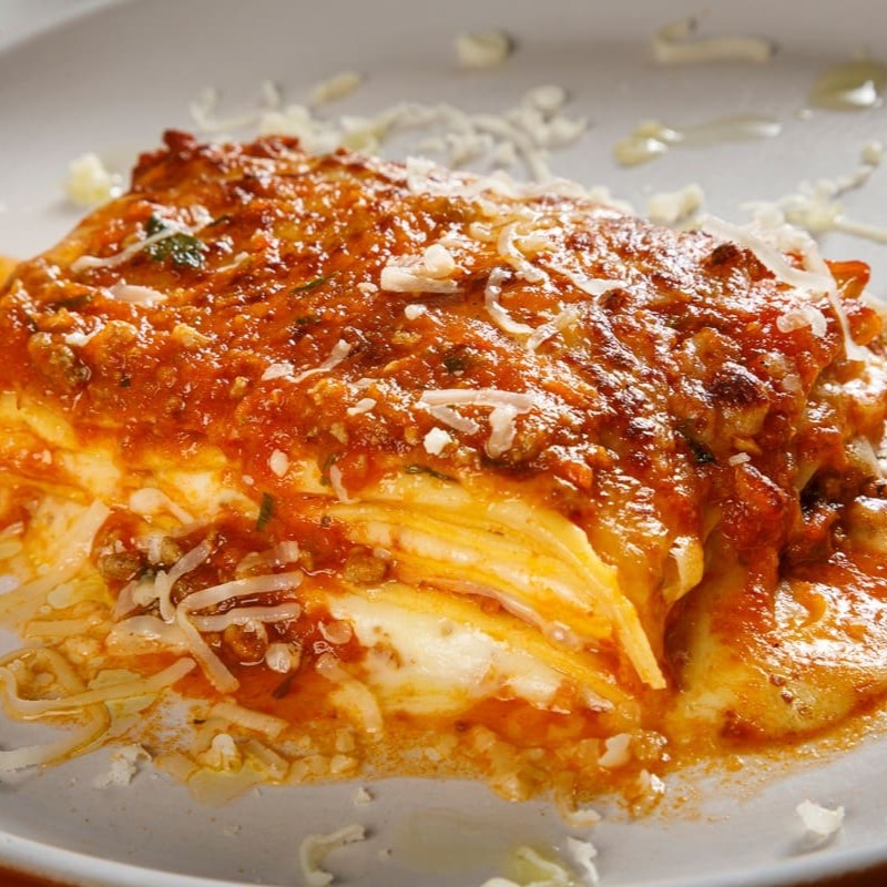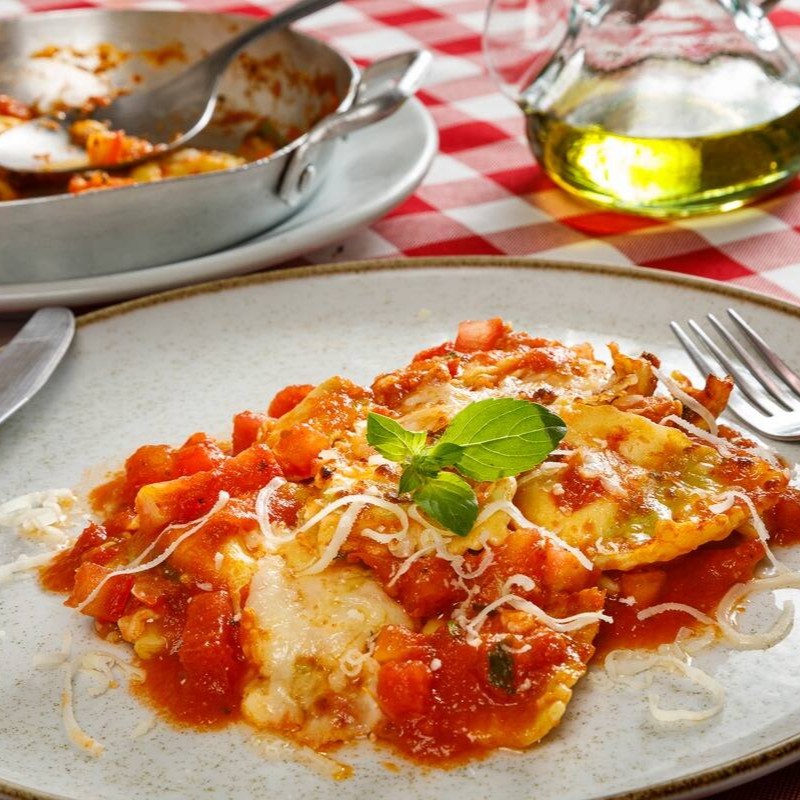 Parmegiana de mignon ao molho de tomate fresco acompanhada de massa recheada de sua preferencia gratinado ao forno.