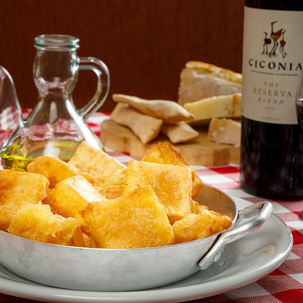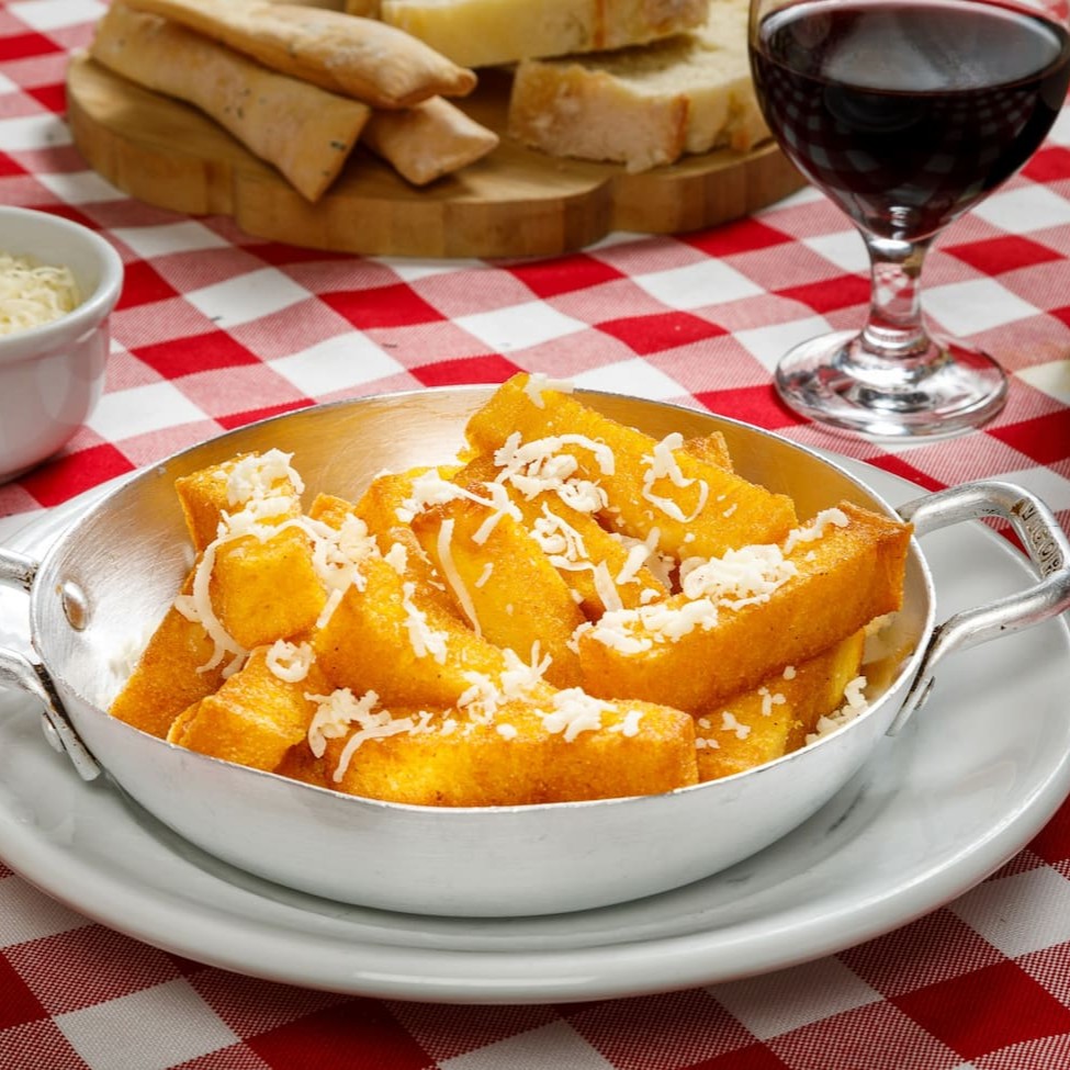 Polenta cremosa por dentro e chocante por fora, com raspa de provolone.