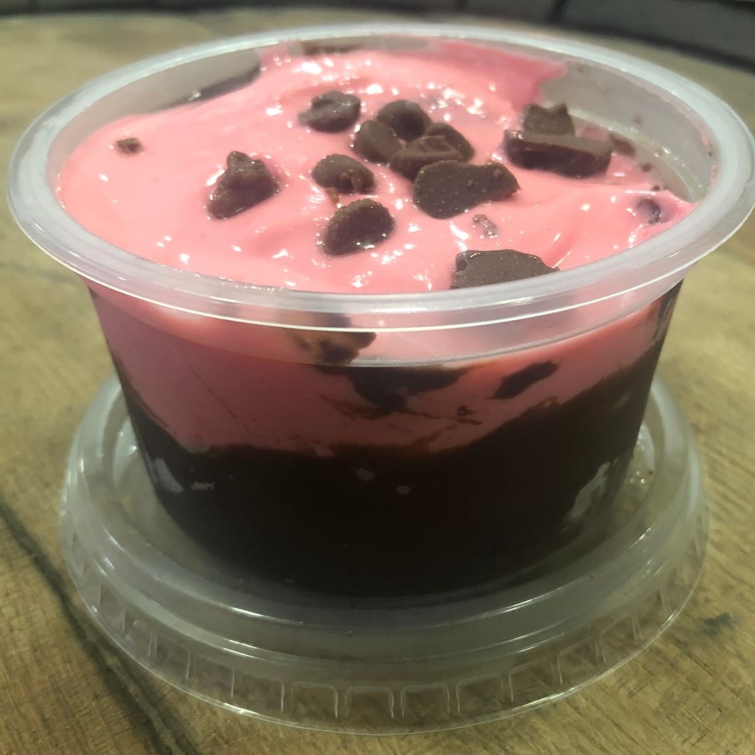 Bolo de chocolate com calda de chocolate e musse de morango.
