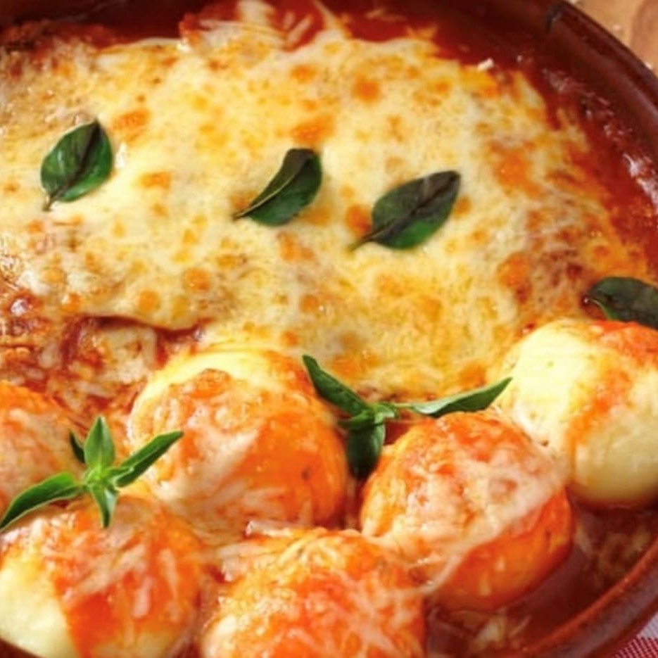 2 polpetone recheado de mussarela ao molho de tomate fresco gratinado com queijo ao forno.