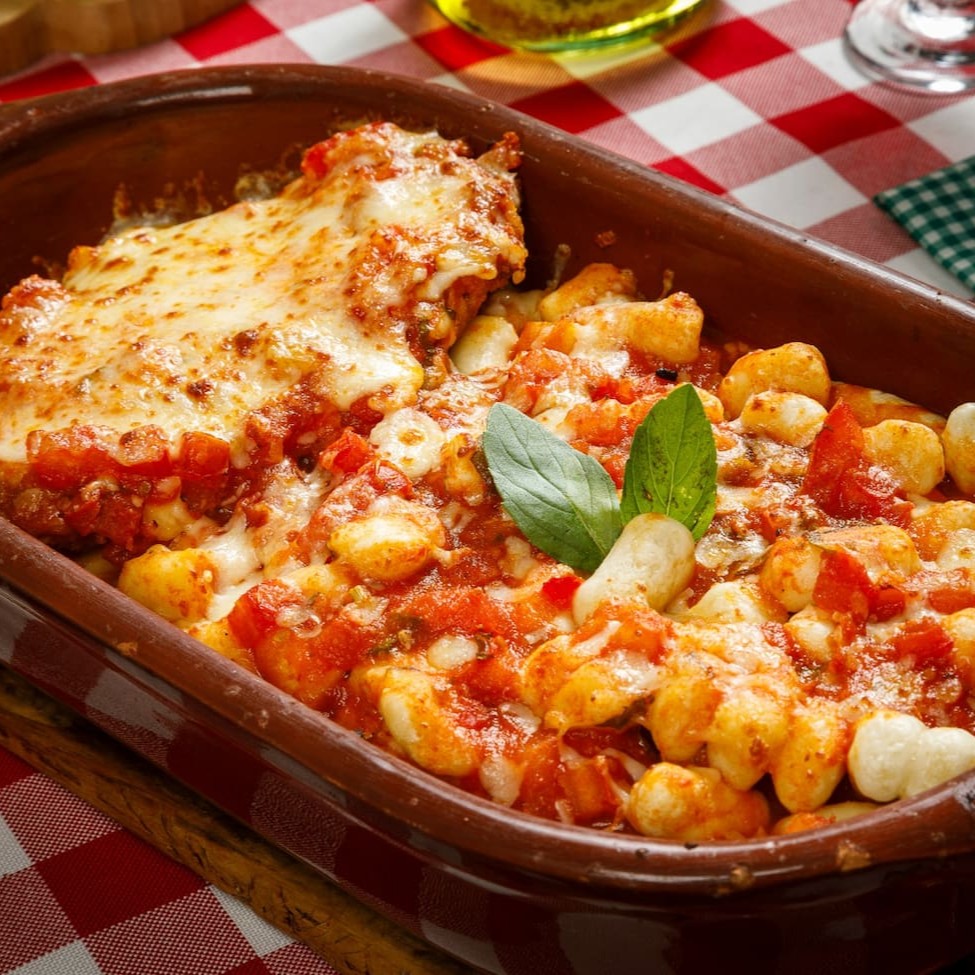 Massa recheado frango desfiado com requeijão cremoso ao molho pomodoro , pedaços de tomate e manjericão fresco com mussarela derretida gratinado ao fono.
