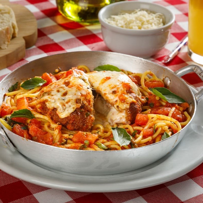 Filé de frango a parmegiana ao molho de tomate fresco acompanhada de massa recheada de sua preferencia gratinado ao forno.