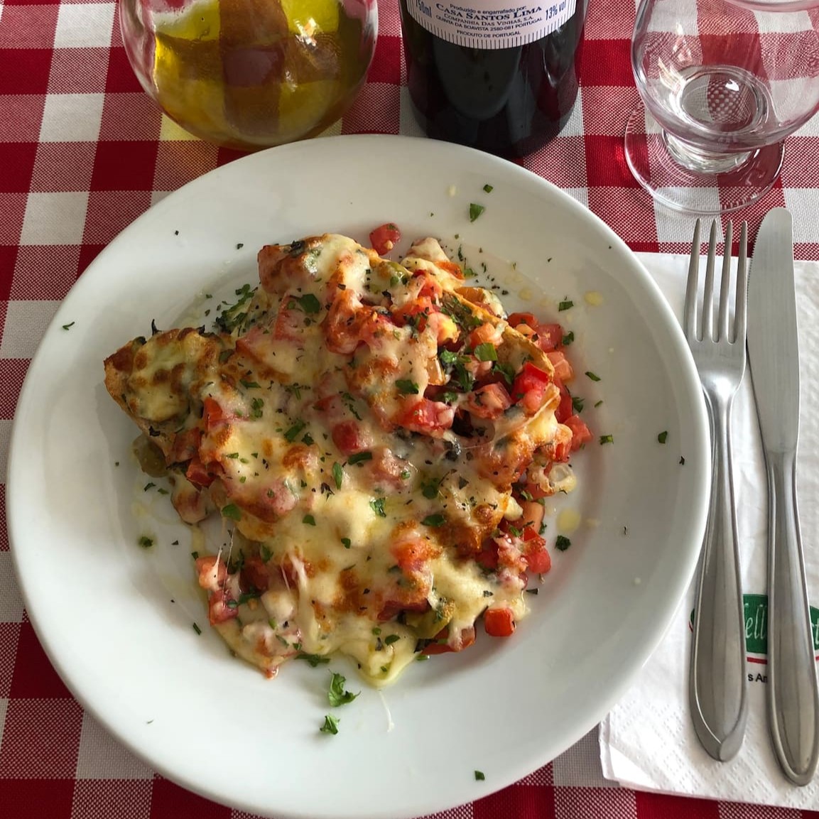 Massa verde, feita de espinafre, recheado Catupiry, parmesão, e manjericão gratinado ao forno.