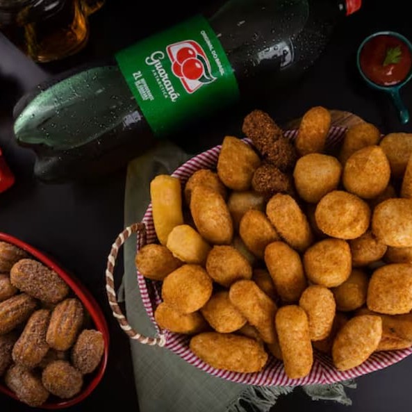 Delicie-se com o nosso combo de 50 mini salgadinhos variados, cuidadosamente preparados para garantir um sabor único e irresistível. Acompanha 10 mini churros, recheados com um doce de leite cremoso que derrete na boca e cria uma experiência inesquecível. Para completar, oferecemos uma refrescante Guaraná Antarctica de 2l, gelada e borbulhante, para harmonizar perfeitamente com os petiscos. Este combo