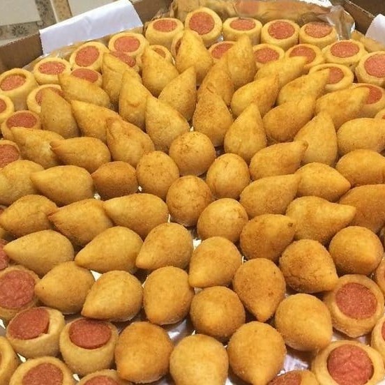Desfrute de 25 mini coxinhas de frango tamanho coquetel. Coxinhas fritas na hora.