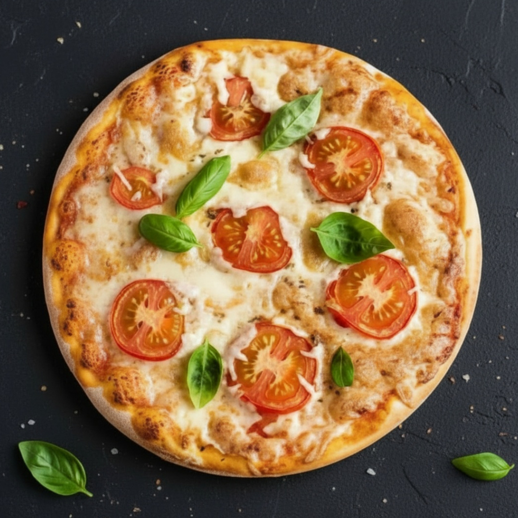 molho de tomate fresco da casa , mussarela e fatias de tomate.