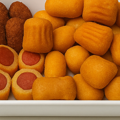 salgados com fabricação própria, ingredientes selecionados, feito com massa de batata, salgados, sequinhos e crocantes frito na hora do pedido