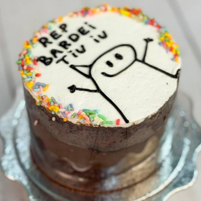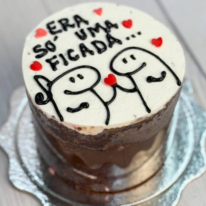 Entrando na onda da galera, trouxemos esse bolinho pra presentear de forma diferente. Serve uma, no máximo duas pessoas. Lateral envolvida em acetato para melhor sustentar o bolinho. Pesando cerca de 400g.