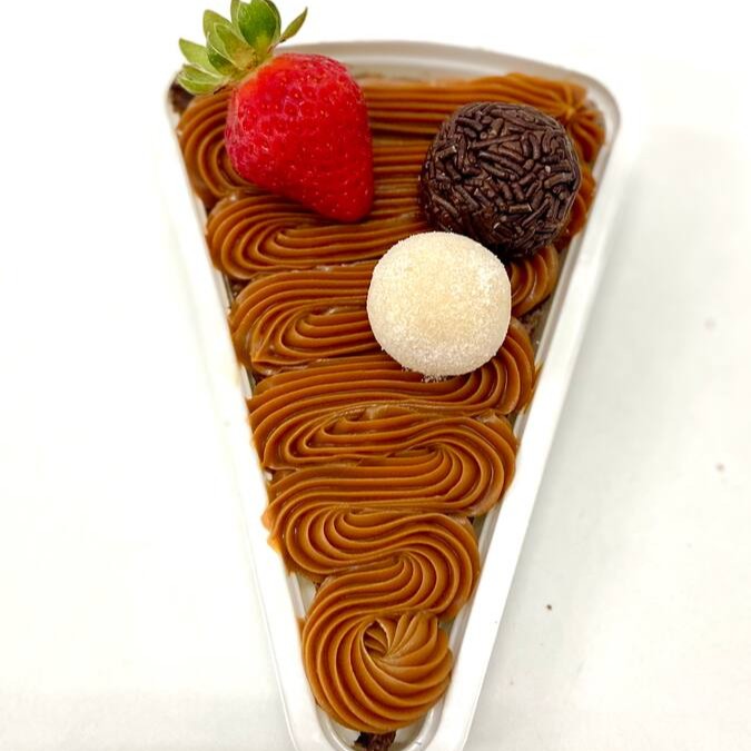 Brownie tradicional coberto de doce de leite, versão simplesmente maravilhosa. Acompanha um morango, um brigadeiro tradicional e um brigadeiro de Ninho.