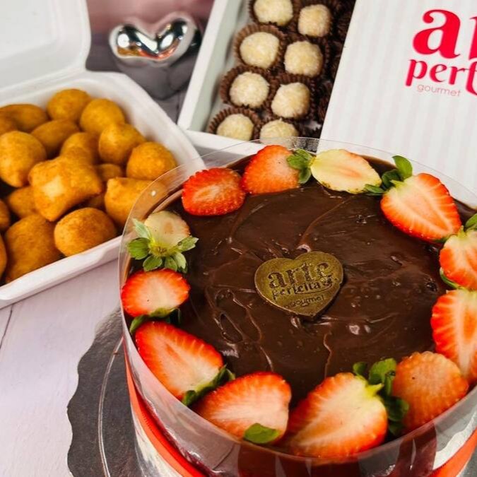 Contém 1 saboroso e fofo bolo médio com cavidade para cobertura de brigadeiro ao leite, uvas (em média 10), morangos (6), brigadeiros (3) e beijinhos (3). É uma ótima opção para presentear quem vc ama!