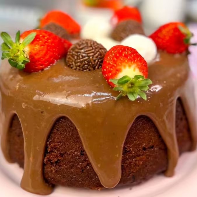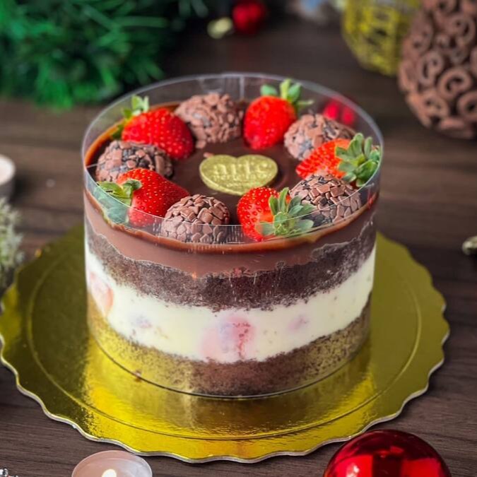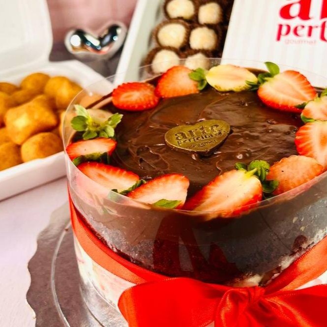 Muita cobertura de brigadeiro trufado, massa fofinha de chocolate, e morangos frescos com Ninho e docinhos. Combinação perfeita pra uma comemoração especial ou simplesmente se esbaldar numa deliciosa sobremesa. Serve ate 8 porções generosas
