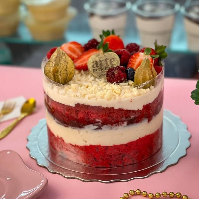 Mais um de nossos bolos deliciosos e lindos acaba de entrar para o nosso cardápio. Bolo Piscininha Red, trás uma massa fofa e macia de red velvet, nossa geléia caseira de frutas vermelhas para um equilíbrio maior de sabores, cobertura do nosso maravilhoso brigadeiro de Ninho, frutas frescas, morangos, amoras e mirtilos completam essa delicadeza de sobremesa. Este bolo pode servir facilmente de 8 a 10 pessoas e será um encanto na sua mesa.