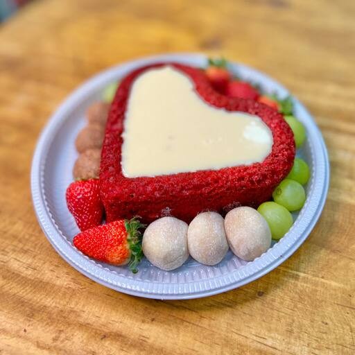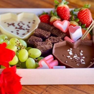 Foundue repleto das melhores frutas, nosso Brownie chocolatudo e lindos marshmellows de coração! Nossos chocolates branco e preto com ganache ao leite e ganache branco completam esse lindo cenário para aquela noite especial com quem você ama!