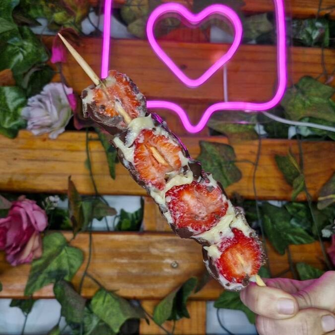 Esse espeto sem dúvida é uma das melhores coisas que vc ja provou!!! Com morangões suculentos e nosso delicioso brigadeiro de Ninho já é perfeito, banhado no chocolate blend então, fica surreal de gostoso. Não tem como não gostar desse novo item do nosso cardápio!