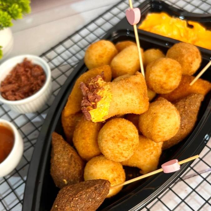 Nossos salgados são sucesso em nosso cardápio, sempre fresquinhos, fritos na hora, agora fizemos uma versão super saborosa, que contém 24 salgados sortidos. Creme de cheddar ou catchup a sua escolha e uma irresitível farofa de Bacon crocante.