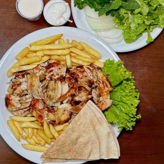 Frango, batata frita, cebola, pasta de alho e tahine.