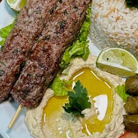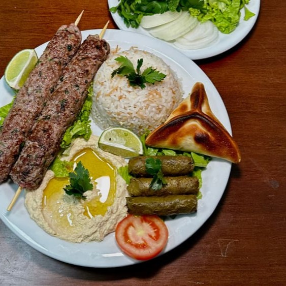Arroz, salada, pasta, Kafta (1 espetinho), Ou Bife de frango ou carne ou Falafel.