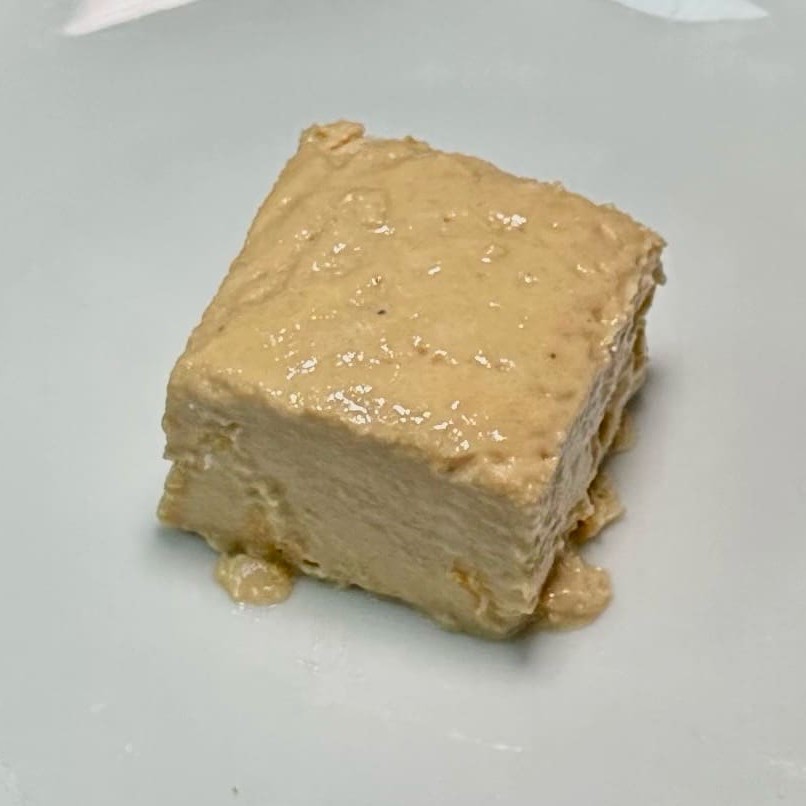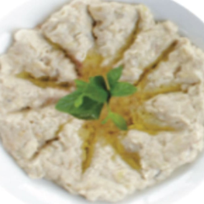 Beringela, tahine, suco de limão e azeite, acompanha pão arabe.