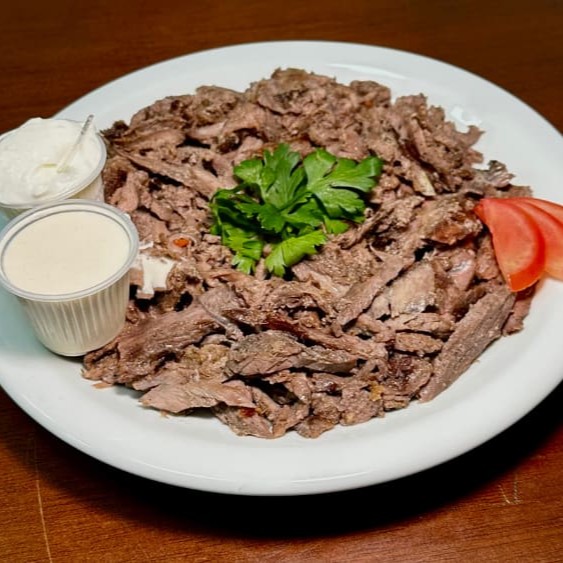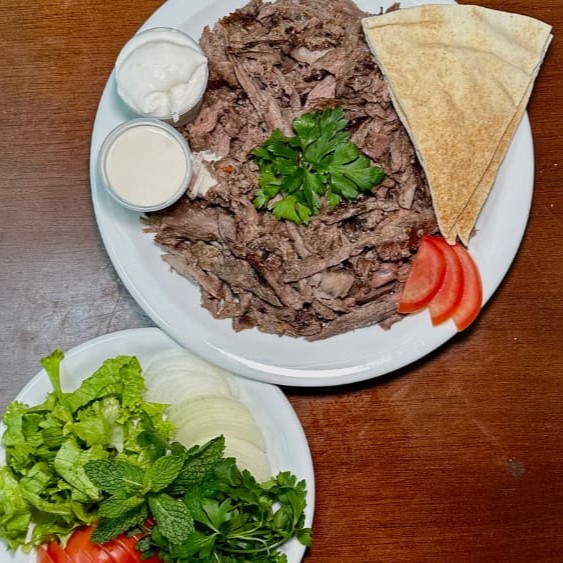 Carne Bovina, salsinha, tomate, cebola e pasta de alho e tahine.