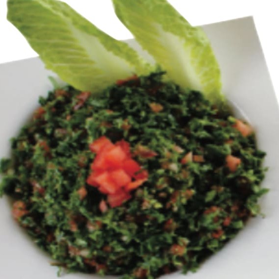 Trigo para kibe, salsinha, tomate, cebola, suco de limão e azeite. Acompanha pão arábe.
