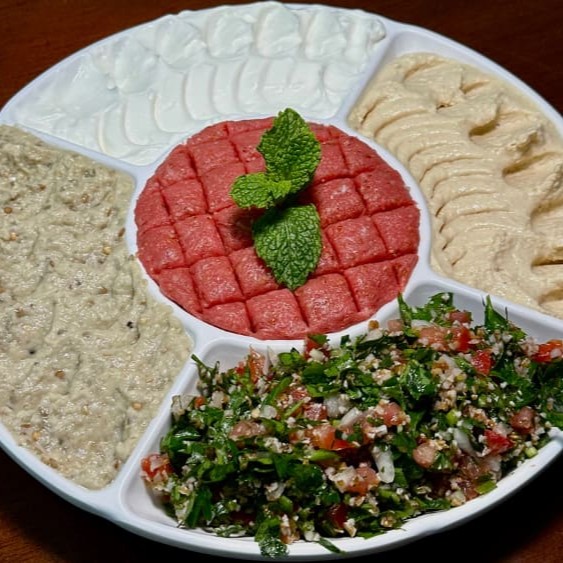 Carne bovina e frango C/ salsinha, cebola, tomate, pasta de alho, tahine e pão arábe.